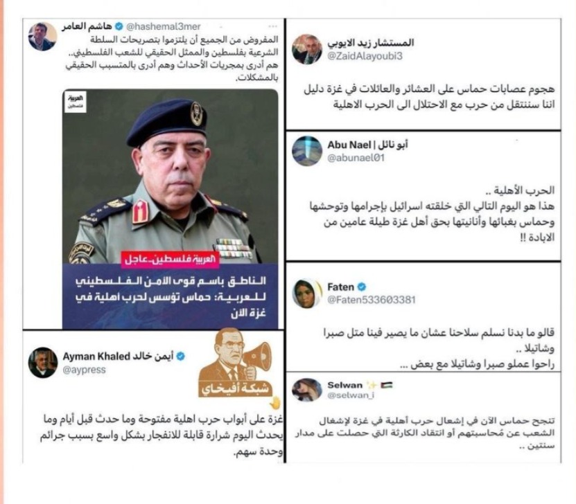 تدفع حسابات عربية مرتبطة بالمنظومة الإعلامية للجيش الإسرائيلي، المعروفة بشبكة أفيخاي، برواية مفادها أن غزة بدأت تعيش واقع الحرب الأهلية وذلك فور إعلان وقف إطلاق النار وإنهاء حرب الإبادة الإسرائيلية.