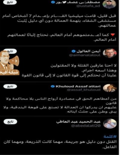 وقد نشرت حسابات شبكة أفيخاي عشرات المنشورات على المنصات الاجتماعية، مستخدمة لغة موحّدة تدّعي “رفض الإعدامات خارج القانون”، وتطالب “بمحاكم عادلة”، متناسية أن هؤلاء العملاء قدّموا معلومات مباشرة للاحتلال أدت إلى اغتيال قادة ميدانيين وتدمير منازل.