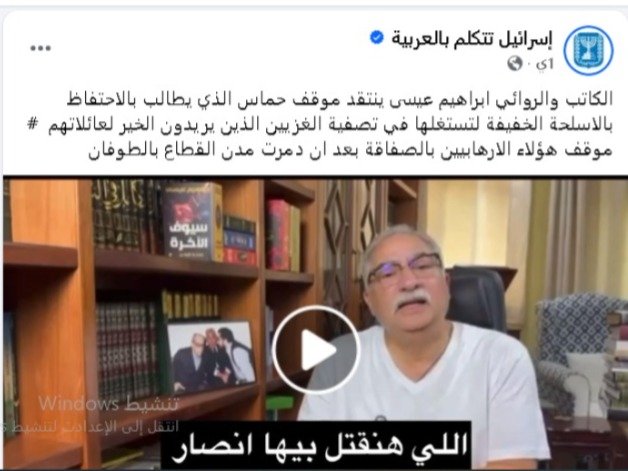 وروجت الحسابات الإسرائيلية وبينها (إسرائيل تتكلم العربية) مقطع فيديو لابراهيم عيسى ينتقد ما وصفه موقف فصائل المقاومة الذي يطالب بالاحتفاظ بالأسلحة الخفيفة، زاعما أن ذلك يستهدف “تصفية الغزيين الذين يريدون الخير لعائلاتهم”.
