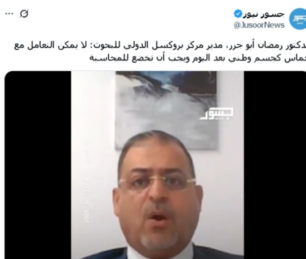 ومن على منبر منصة جسور نيوز الممولة إماراتيًا، زعم رمضان أبو جزر أنه لا يمكن التعامل مع حركة حماس وفصائل المقاومة الأخرى “كجسم وطني بعد اليوم”، وأنه يجب أن تخضع المقاومة لـ”المحاسبة”.