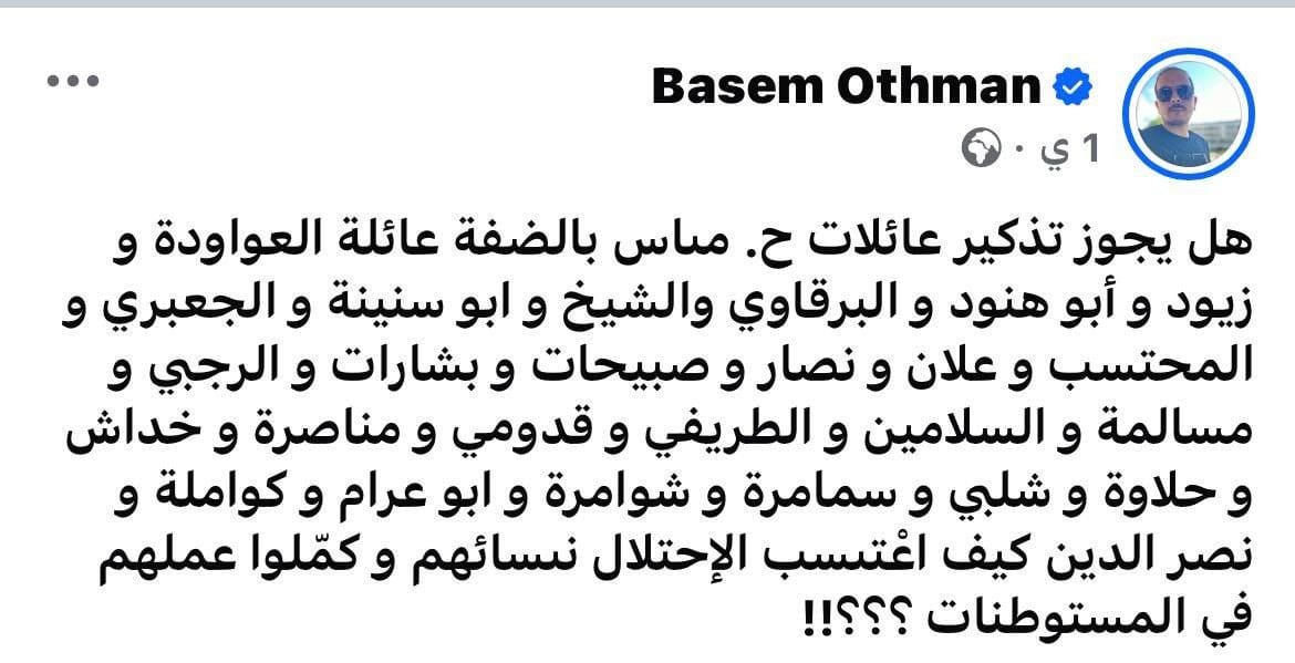 ونصّ المنشور الذي تداوله ناشطون على نطاق واسع يسأل بلهجة استفزازية عمّا إذا “يجوز تذكير عائلات” كبيرة في الضفة باسمهَا، ويُدرج قوائم طويلة من الألقاب والعائلات، مزعومًا أن بعض أفرادها “أكملوا عملهم في المستوطنات” فضلا عن مزاعم بتعرض نسائهم للاغتصاب من جنود الاحتلال.