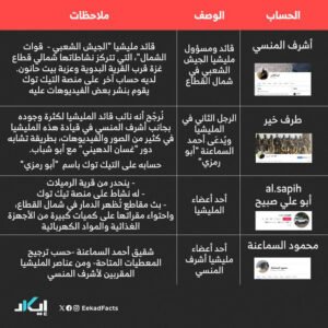 موقع إيكاد يكشف في هذا التحقيق الصحفي بعد تحليل معمّق لصور الأقمار الصناعية وتتبع دقيق لمنشورات قادة المليشيا على مواقع التواصل، عناصر الهيكل القيادي لمليشيا أشرف المنسي شمال القطاع، وتحدّد مناطق انتشارها داخل مربعات حساسة.