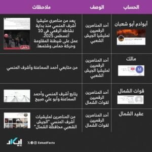 وآخر الحسابات المؤيدة للمليشيا كان حساب “قوات الشمال”، الذي وجدنا أنه يتابع بشكل مباشر المنسي والسماعنة وأبو علي صبيح، ما يعكس شبكة دعم إلكترونية تعمل على تضخيم محتوى المليشيا.