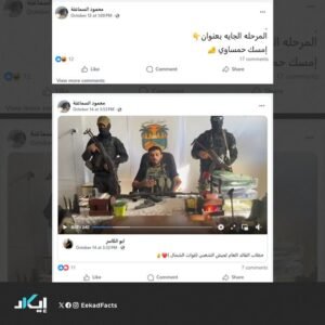 وبتحليل صفحته، وجدناه نشر في 12 أكتوبر تهديدًا مباشرًا لحماس معلنًا أن “المرحلة الجاية إمسك حمساوي”، قبل أن يعيد في 14 أكتوبر مشاركة خطاب المنسي المصوّر، في اصطفاف واضح داخل المليشيا.
