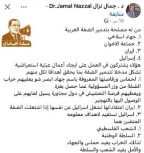 وتنطلق تغريدة نزال من فرضية مركزية مفادها أن “تدمير الضفة الغربية” يخدم مصالح أطراف عدة، عدّدها نزال صراحة: الجهاد الإسلامي، جماعة الإخوان المسلمين، إيران، إسرائيل، و”مقاولون يبحثون عن عبثية استعراضية”.
