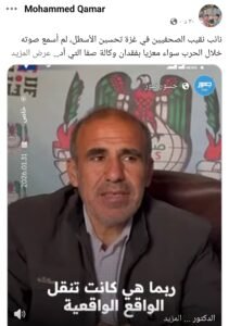 رئيس تحرير وكالة “صفا” محمد أبو قمر عبر عن صدمته من أداء نائب نقيب الصحفيين في غزة تحسين الأسطل.