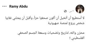 وقال إن ما جرى لا يمكن فصله عن تخلي فعلي عن الدور النقابي، مشيرًا إلى أن الإشادة بمنصة ليست فلسطينية جاءت بدلًا من الوقوف مع الصحفيين الذين فقدوا زملاءهم ومؤسساتهم تحت القصف.