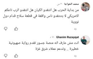 أما الشاب سامي مرس فذهب أبعد في لهجته، متسائلًا بسخرية مريرة: “لما محطة مثل جسور نيوز رواتبها من الصهاينة والإمارات الصهيونية، شو بنتوقع منها؟ أكيد مش تعمل مقابلات مع ناس شرفاء”.