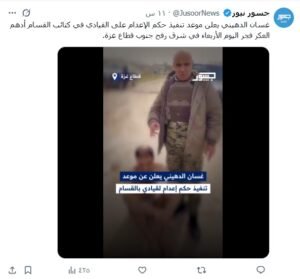 أحدث الأمثلة على ذلك اهتمام جسور نيوز بنشر خبرا للداعشي الجاسوس الدهيني وهو يهدد بإعدام القيادي في كتائب القسام أدهم العكر المعروف بـ”أبو بكر”.