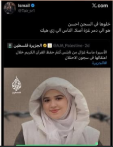 أثار المدعو في شبكة أفيخاي إسماعيل أبو طير جدلاً واسعاً، بعد نشره تدوينة على صفحته في منصة «إكس» تضمنت عبارات اعتبرها كثيرون مسيئة ومثيرة للغضب، لما حملته من تمني استمرار اعتقال أسيرة فلسطينية لدى الاحتلال رغم حفظها للقرآن الكريم داخل السجن.
