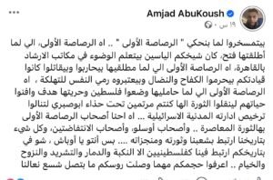 وفي منشورات أخرى، سخر أبو كوش من المدنيين والشهداء، أو حين قلل من استشهاد المقاومين وقارن العمليات بنتائجها على الاحتلال، في صورة واضحة لدعاية تهدف لتشويه المقاومة وتجريم الكفاح الوطني.
