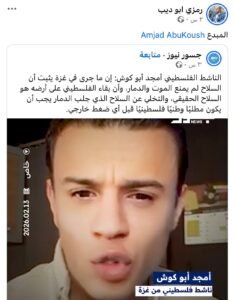 يواصل المدعو أمجد أبو كوش مهاجمة المقاومة والدعوة لتسليم سلاحها وتحميلها مسؤولية الدمار في غزة عبر منصة “جسور نيوز” الصهيونية، رغم دعوات المقاطعة المتكررة.