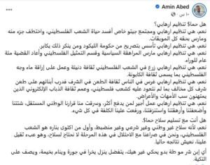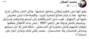وأشار إلى أن «أجمل ما قاله هو الإقرار بضرورة التواصل مع حركة حماس، وكذلك الحديث عن دخولها إلى منظمة التحرير»، معتبرًا أن ذلك يعني وجود «توجّه حقيقي ووطني لدى النخبة الفلسطينية من مختلف الفصائل».