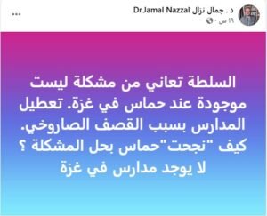 ونشر نزال منشوراً قال فيه إن “السلطة تعاني من مشكلة ليست موجودة عند حماس في غزة، وهي تعطيل المدارس بسبب القصف الصاروخي”، مضيفاً في صيغة ساخرة: “كيف نجحت حماس بحل المشكلة؟ لا يوجد مدارس في غزة”.
