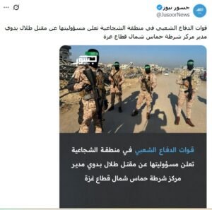 وسارعت المنصة إلى نشر وترويج إعلان عصابات الاحتلال بشأن اغتيال طلال بدوي، مدير مركز شرطة شمال قطاع غزة، بما يساهم في شرعنة اغتيالات العصابات وتطبيعها إعلامياً، رغم ما تمثله من انتهاكات جسيمة وجرائم ميدانية.