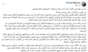 فجر السفير الفلسطيني السابق لدى ألبانيا سامي مهنا، موجة انتقادات حادة ضد سلطة رام الله، كاشفًا عن المظاهر الفساد المالي والتخبط الإداري العميق داخل مؤسساتها، في وقت تتفاقم فيه أزمة تأخر الرواتب والمستحقات لتطال شرائح واسعة من الموظفين، بما في ذلك العاملون في السلك الدبلوماسي.