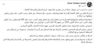 ونشر شعبان على حساباته على مواقع التواصل الاجتماعي، ما قال إنه تسريب بشأن موقف حركة حماس من مقترح المبعوث الدولي نيكولاي ملادينوف لنزع السلاح في غزة والمرحلة الثانية من اتفاق وقف إطلاق النار.