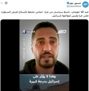 أحدث هذه الحالات تمثلت في نشر مقطع فيديو للمدعو عبد الله حويحي، الذي قدمته المنصة بصفته ناشطًا سياسيًا من قطاع غزة، حيث ظهر في التسجيل وهو يزعم أن الفصائل الفلسطينية، وعلى رأسها حركة حماس، تحتفظ بالسلاح بهدف فرض السيطرة الداخلية على القطاع وليس لمواجهة الاحتلال الإسرائيلي.